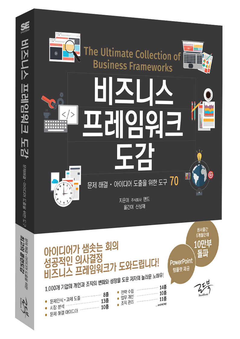 출판 분야에 몸담고 있는 편집자 또한 사실 하루하루 해답이 정해져 있지 않는 문제들을 풀어나가는 것과 같은 느낌입니다. 어떤 문제는 종이에 적어보며 나름의 분석 기법을 동원해 해결 방안이나 더 나은 선택을 찾아보기도 하죠. 아마도 다들 나름의 방법으로 문제를 해결하며 수많은 업무를 수행하고 있겠죠? 그런데, 이러한 과정을 좀더 정교하게 해줄 수 있도록 도와주는 툴이 있습니다. 바로 비즈니스 프레임워크입니다. 이젠 혼자 고민하며 끙끙대지 말고 프레임워크를 활용해 문제의 본질에 집중하고 해결 능력을 키워보면 좋겠습니다.