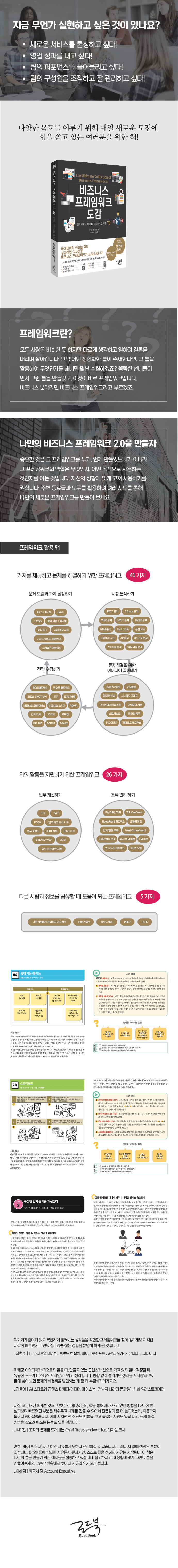 새로운 서비스를 론칭하고 싶다거나, 영업 성과를 내고 싶다거나, 팀의 퍼포먼스를 끌어올리고 싶다거나 하는 등의 다양한 목표를 이루기 위해 우리는 매일 새로운 도전에 힘을 쏟는다. 하지만, 매일매일이 쉽지 않은 도전이고 실패의 연속인 경우가 많다. 이때 바로 도움을 받을 수 있는 것이 비즈니스 프레임워크다. 누구나 쉽게 이 책에서 제시하는 도감을 보고 익히고 웹에서 별도로 제공하는 템플릿으로 연습하며 실행한다면 뛰어난 비즈니스 문제 해결 능력자로 거듭날 수 있을 것이다.