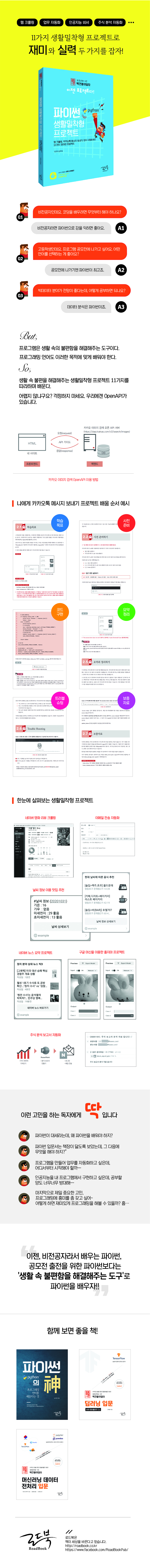 파이썬을 배웠는데 그 다음엔 뭘 할 수 있지? 라는 물음에서부터 기획되었다. 인간의 언어도 사용해봐야 늘 듯이, 프로그래밍 언어도 그렇다. 문법만 배웠다고 자유자재로 말할 수는 없지 않은가? 하지만, 단순하고 재미없는 예제들만 따라하며 배우라고 하면 배움의 길은 고단할 것이다. 그래서 이 책은 누구나 공감할 수 있는 생활밀착형 프로젝트 11개를 직접 구현해보면서 재미와 실력 두 가지를 함께 잡을 수 있도록 구성했다. 웹 크롤링, 업무 자동화, 인공지능 비서, 주식 분석 자동화 등의 프로젝트를 재미나게 배우면서 파이썬 활용 실력도 높여보자.