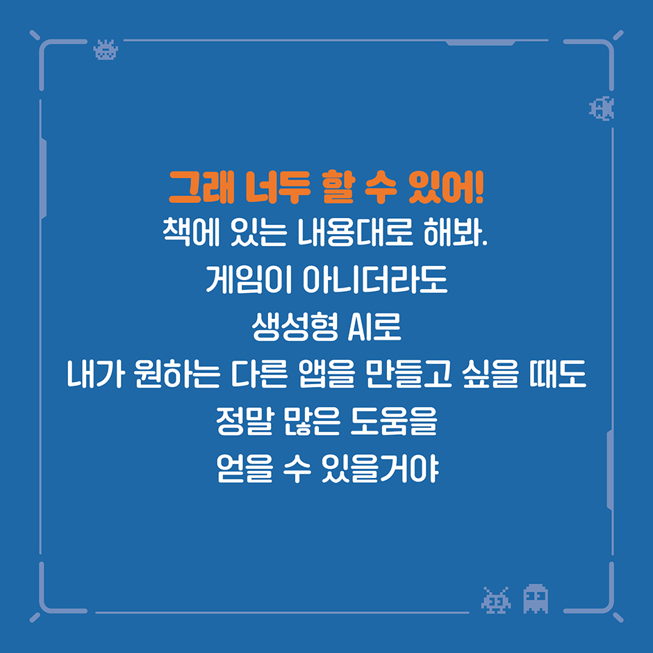 ChatGPT, Tesor.Art, Udio 등의 생성형 AI를 활용하여 게임을 만들고 앱 스토어에 배포까지 따라하며 배울 수 있는 책이다. AI로 게임을 만들기 위해서는 많은 시행착오를 겪어야 하지만, 저자가 먼저 수많은 시도와 실패로 얻은 경험을 책에 녹여냈다. 출간 전에 이 책의 내용으로 2주 간의 특강을 진행하였는데, 10명의 수강생이 자신만의 게임을 만들어 앱을 성공적으로 배포할 수 있었다. 코딩을 잘 모르는 독자도 좋은 아이디어만 있다면 한번 도전하여 멋진 게임을 유료로 배포하는 성공의 기쁨을 맛보길 바란다.
