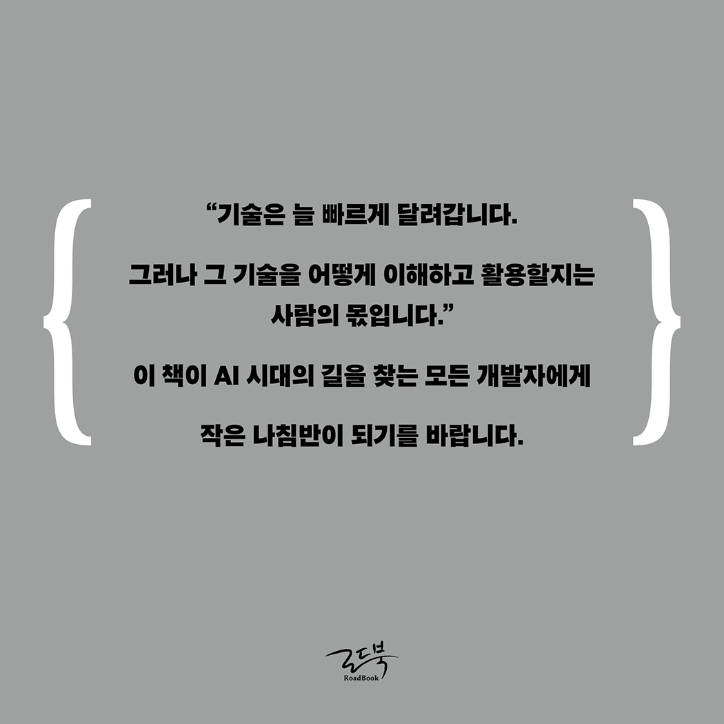AI를 단순히 이해하는 것을 넘어, 이 시대에 어떤 개발자가 되어야 하는가를 묻고 답하는 책이다. 혼돈의 시대 속에서도 스스로의 위치를 다시 정하고, 능동적으로 성장하려는 개발자에게 이 책은 확실한 방향과 용기를 줄 것이다.
