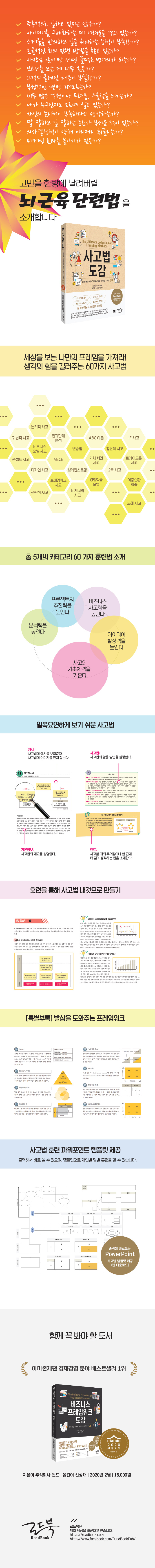 홈트레이닝을 하면서 몸을 단련하고, 명상을 하면서 정신을 맑게 하는 것처럼 이 책으로 사고법을 연마하면서 뇌의 잔근육을 단련해보세요. ‘이럴 땐 이렇게 생각하면 쉽게 풀리는구나’, ‘저 사람을 설득하려면 이렇게 설명하면 되겠구나’ 식의 다양한 시도와 경험을 쌓다 보면 막연하게 보이지 않던 길이 보이고, 고민도 빨리 해결될 것입니다.